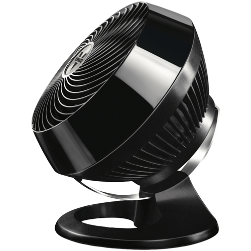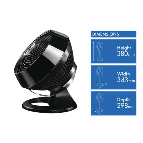 Stir up a vortex of air circulation in your home with the Vornado Large Air Circulator. This powerful black floor fan features Whole Room Vortex Technology that circulates air up to 30.5 metres throughout the entire room. With its multidirectional airflow and a fully adjustable chrome glide bar you can direct the cooling breeze exactly where you want it. The 4-speed settings let you customize airflow levels for ideal comfort. At 380mm tall with a 343mm wide base this sturdy 3.3kg fan provides long-lasting performance thanks to its durable build. Plus Vornado backs it with a fantastic 5 year warranty for added peace of mind. Bring fresh constant airflow to any room with the Vornado Large Air Circulator. The manufacturer's part number for this product is 71660. Choose this floor fan now for whole room circulation.