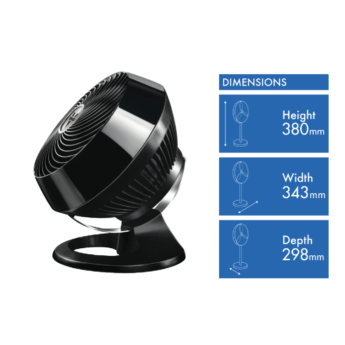 Additional Features Whole Room Vortex Air Circulation, Multidirectional Air Flow, Moves Air Up To 30.5m, Fully Adjustable Chrome Glide Bar