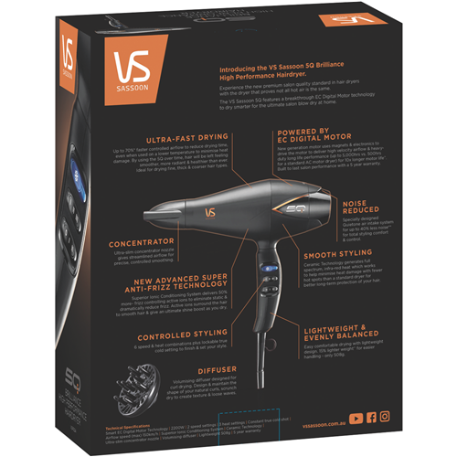 Take your hair styling to the next level with the VS Sassoon 5Q Brilliance High Performance Hair Dryer. This 2200W dryer boasts superior ionic conditioning to tame frizz and provide smooth sleek results. The lightweight design with quiet airflow allows comfortable drying while 2 speed settings and 3 heat settings including cold shot give you maximum control. Ceramic technology ensures even heating and the ultra-slim concentrator nozzle concentrates the 150km/h airflow for precision styling. With faster drying smoother hair and less noise you can achieve salon-quality looks at home. The easy-grip handle 2.8m cord and hanging loop maximize convenience. Backed by a 5 year warranty this advanced dryer combines power and performance for flawless hair day after day. The manufacturer's part number for this product is VSP5QA. Shop now for the ultimate hair styling experience.