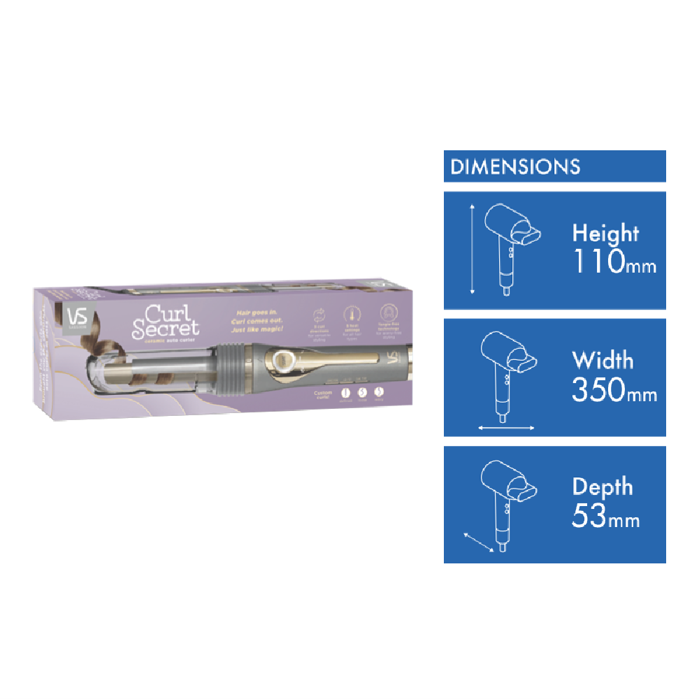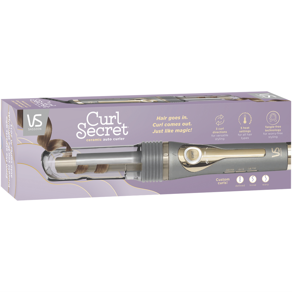 Take your curls to the next level with the VS Sassoon Curl Secret Ceramic Auto Curler. This innovative hair curler delivers salon-style curls and waves in minutes with its foolproof tangle-free technology. Simply place a section of hair in the ceramic barrel select your desired curl direction and size and let the Curl Secret work its magic. Three preset curl types - defined loose or wavy - give you endless styling possibilities. The fast heat-up and ionic conditioning provide smooth frizz-free curls every time. With its clear barrel cover you can check curl progress. Safety features like auto-shut off and low energy mode give you peace of mind. Showcase your inner stylist with the rotating multidirectional barrel that makes professional curls effortless. Bring out your inner celebrity with this innovative curling wand from VS Sassoon. VSC1041A. 2 year manufacturer's warranty.