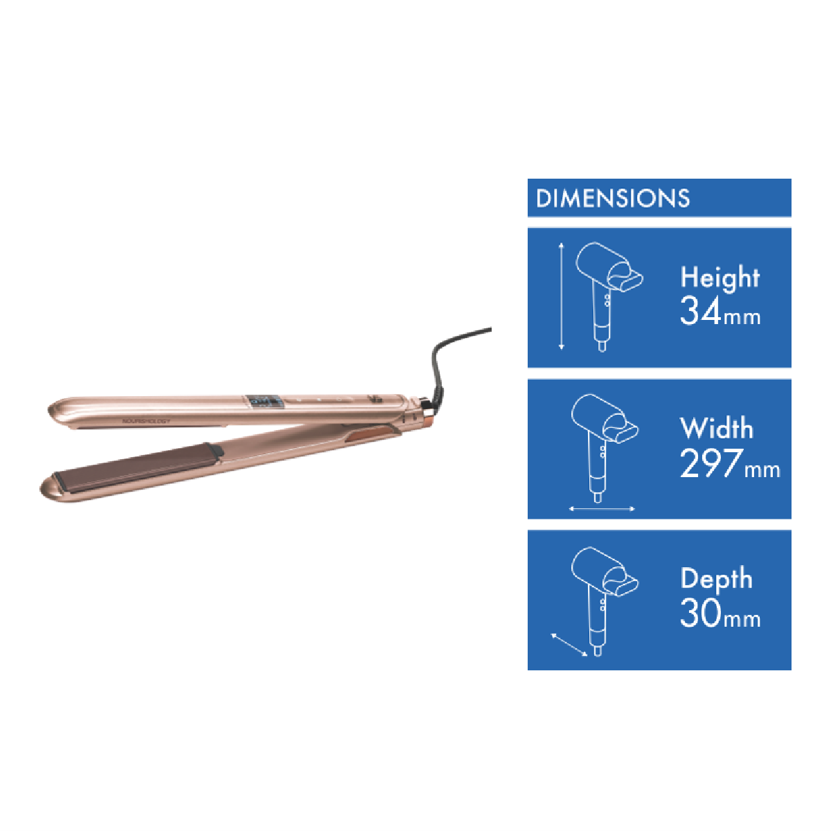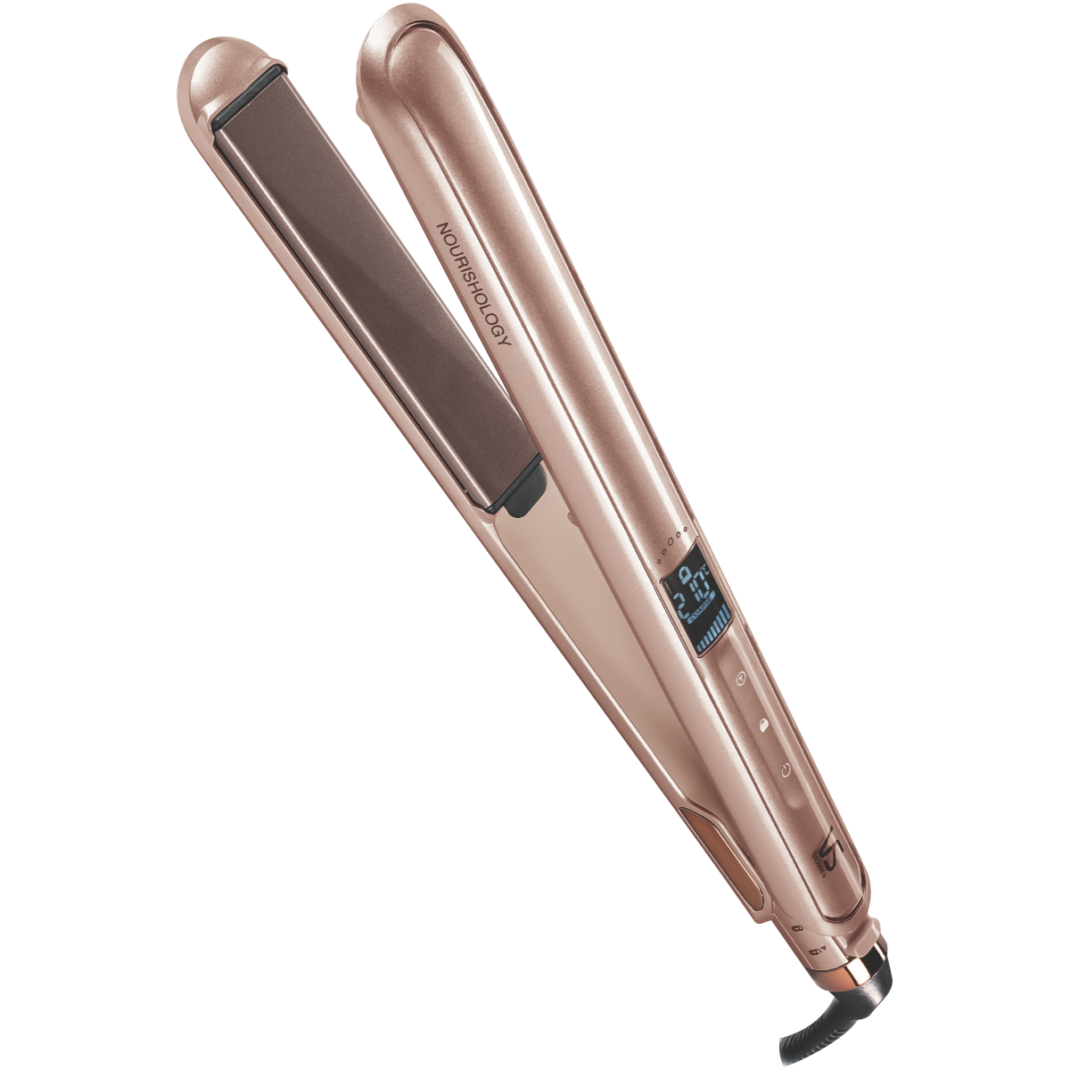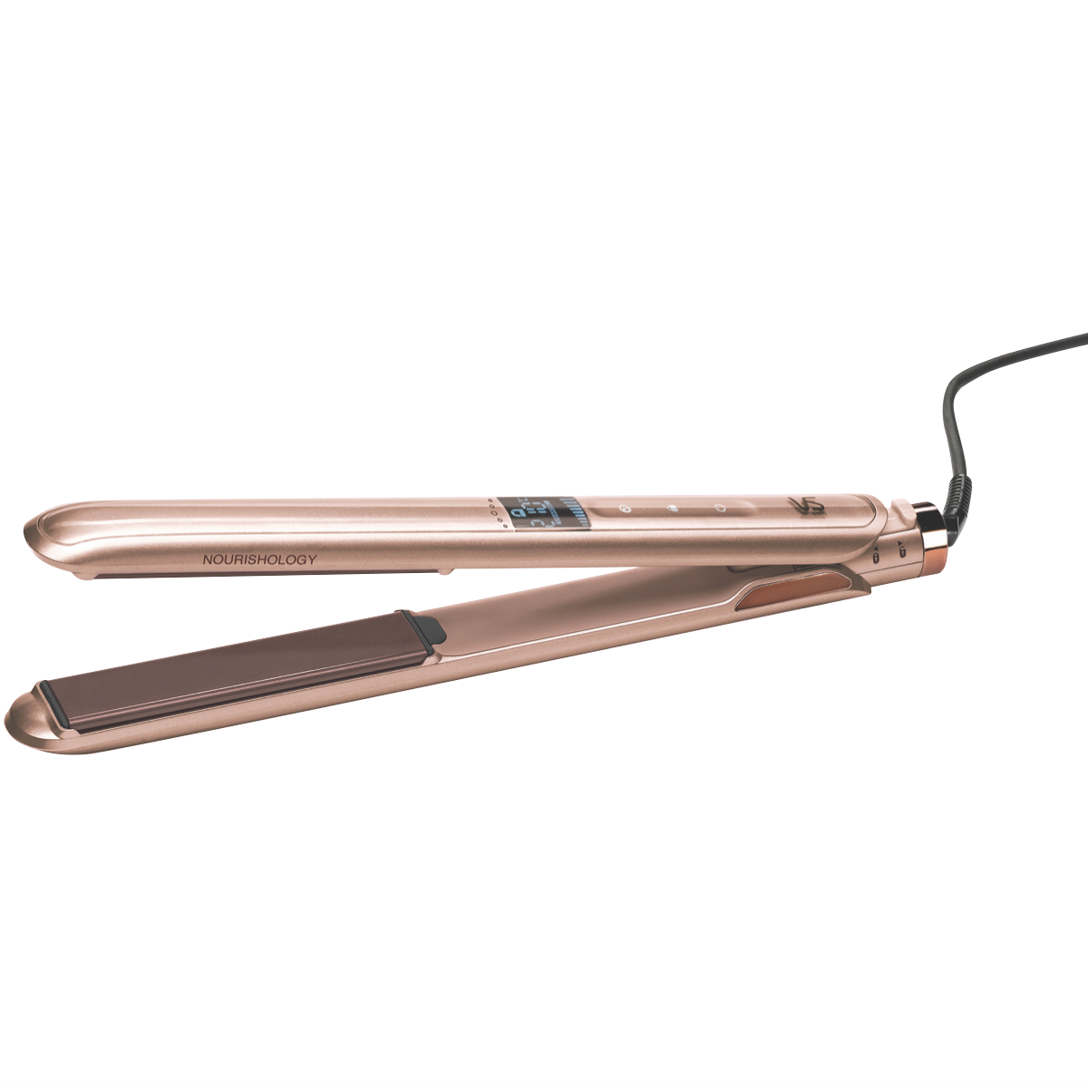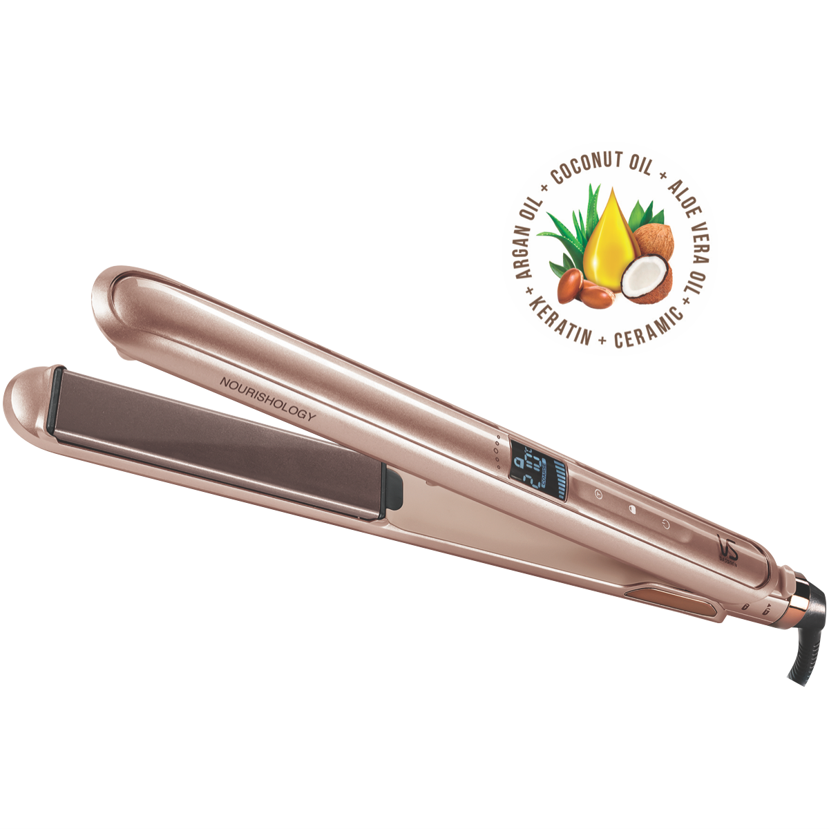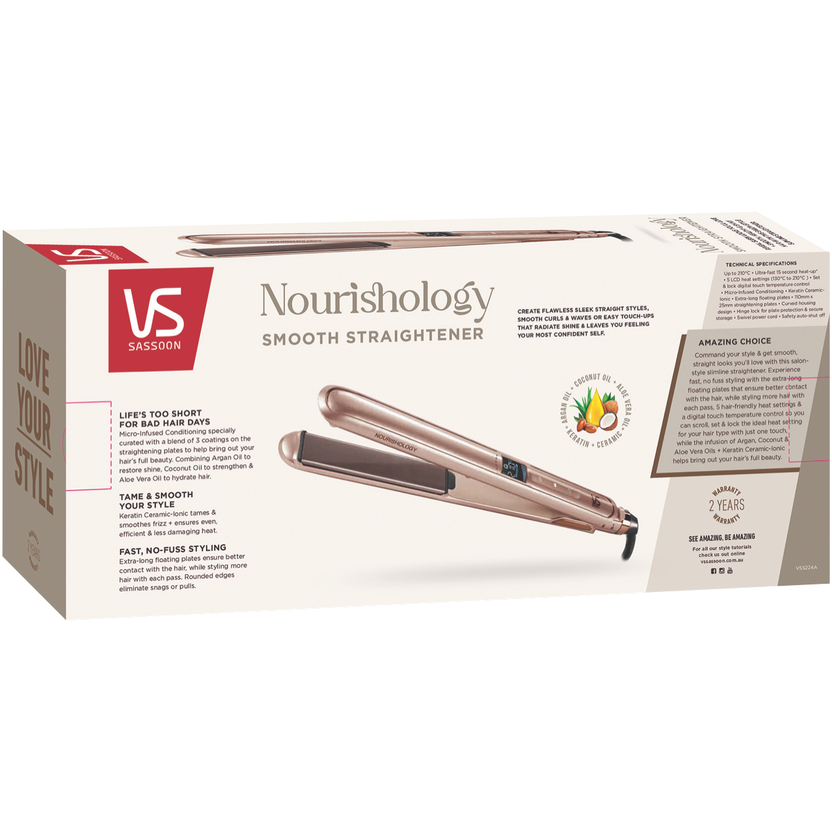 Transform your hair with the gold VS Sassoon Nourishology Smooth Straightener. Its breakthrough ionic conditioning technology infuses each strand with micro-conditioners to leave hair frizz-free and luminously smooth. The keratin ceramic plates glide effortlessly through hair while locking in moisture. With an ultra-fast 15 second heat up and 5 LCD temperature settings from 130C to 210C you can style hair at the ideal heat. The extra-long 110mm plates straighten large sections in a single pass saving time. It automatically shuts off after 60 minutes for safety and peace of mind. Additional features like the swivel cord and curved housing offer greater flexibility and comfort when styling. Plus the hinge lock protects the floating plates for secure storage. Covered by a 2 year warranty this innovative straightener nourishes hair for a smooth sleek finish. The manufacturer's part number for this product is VSS224A. Transform your look with the nourishing power of the VS Sassoon Smooth Straightener today.