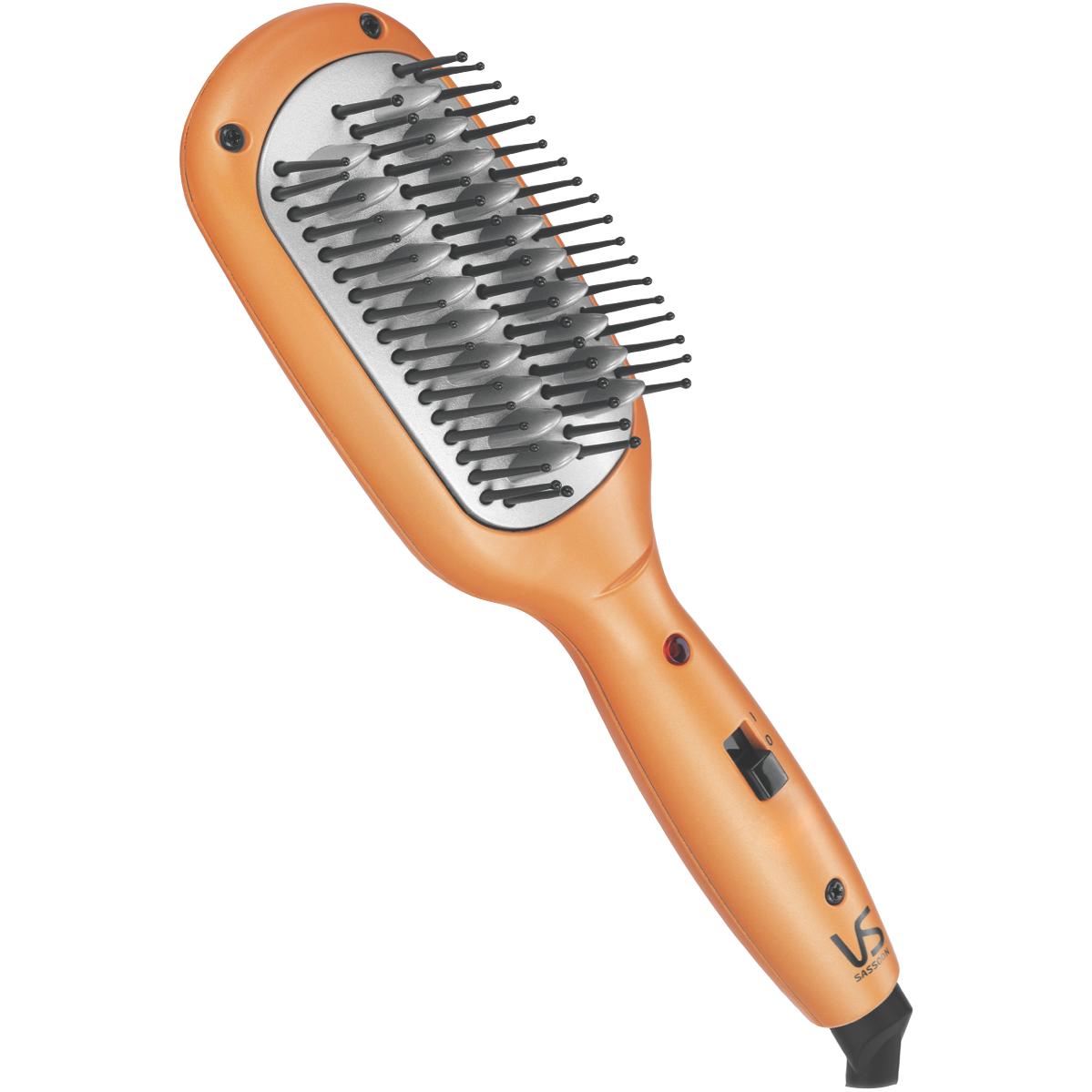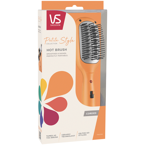 Get ready to transform your hair styling routine with the VS Sassoon Petite Hot Brush. This lightweight 150g peach-coloured styler lets you create gorgeous curls or smooth sleek strands in a flash. The ceramic-coated plates ensure even heat distribution and ionic conditioning to care for your locks. With a precise temperature of 190°C LED indicator light and worldwide voltage you can style your hair just the way you want no matter where you are. The 2m swivel power cord gives you flexibility to manoeuvre the brush and create perfect curls waves or pin-straight hair. Weighing just 150g the petite hot brush is easy to handle and perfect for short styles or fringes. The included heat mat provides a safe place to rest the hot brush when not in use. Achieve salon-worthy styles at home with this versatile lightweight hot brush. Experience the latest in hair styling technology today. The manufacturer's part number for this product is VSLE112A. Check out the VS Sassoon Petite Hot Brush now to elevate your hair game.
