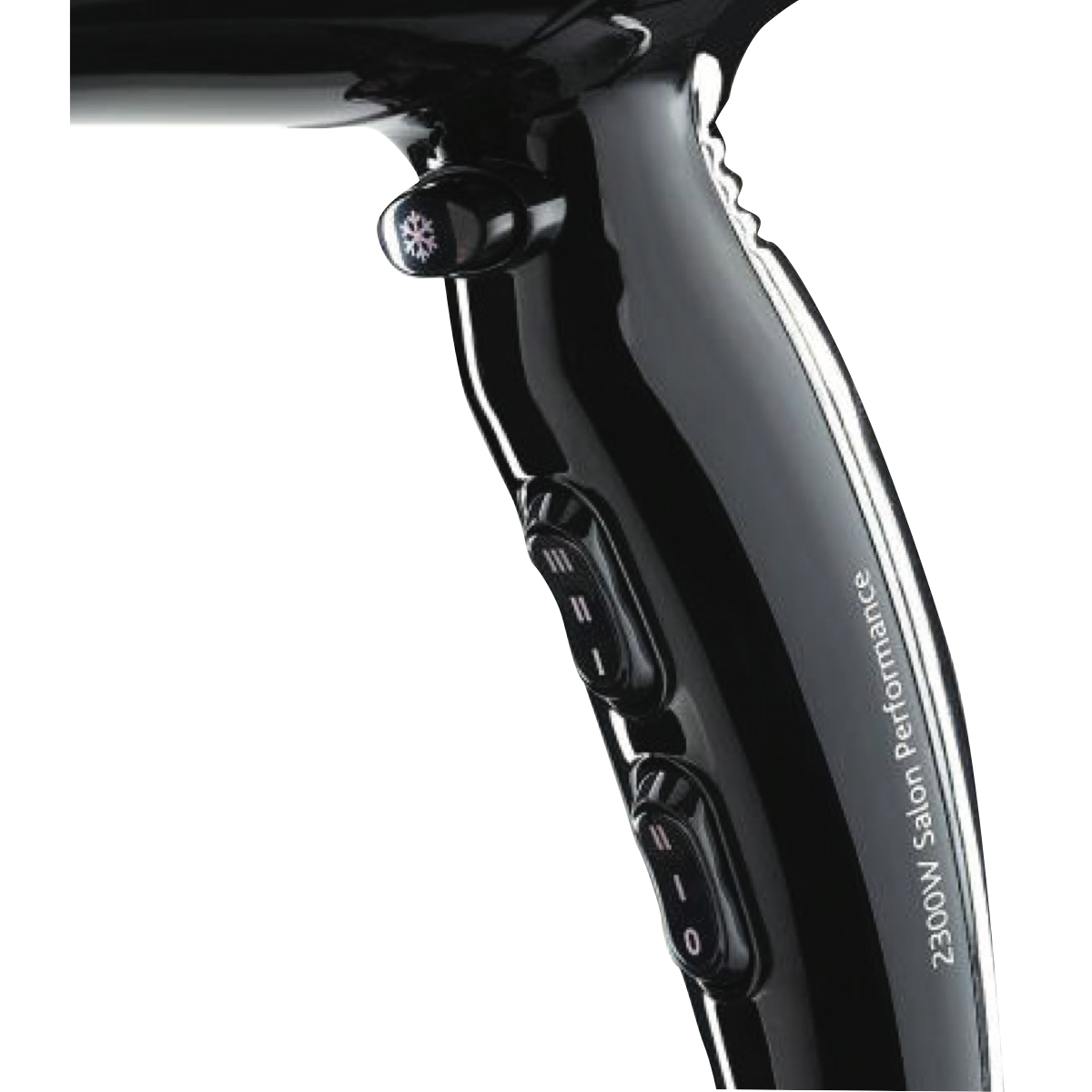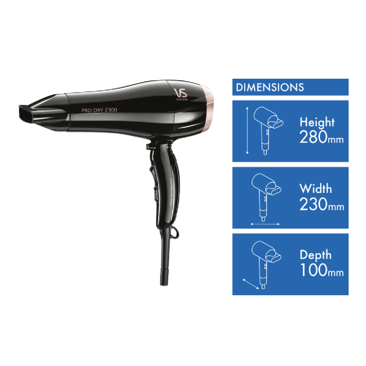 Dry your hair quickly and easily with the sleek VS Sassoon Pro Dry 2300 hair dryer. This powerful dryer features a 2300W motor and two speeds for maximum control and versatility when styling your hair. The lightweight design with hanging loop makes storage simple and the direct current motor and cool shot button help lock in your look. With 2300 watts of drying power this hair dryer makes short work of wet locks. The two speed settings allow you to adjust airflow for precision styling while the cool shot button sets your style for long-lasting results. Weighing in at just 0.445kg the ergonomic body is easy to maneuver and store thanks to the built-in hanging loop. Achieve salon-quality blowouts at home with this feature-packed VS Sassoon hair dryer. The manufacturer's part number for this product is VSD120A. Check out this hair dryer to upgrade your at-home styling routine today.