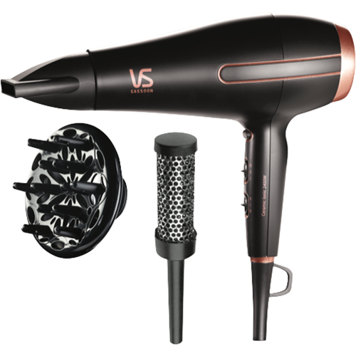 Get salon-quality blowouts at home with the VS Sassoon Super Power 2400 Hair Dryer. This powerful 2400W dryer features a long-life salon grade motor to deliver hassle-free drying and styling. With two speed settings and three heat options including a True Cold Shot button you can achieve smooth frizz-free styles. The ionic conditioning and tourmaline minerals give hair a smooth shiny finish while reducing static. An extra-long 2.8m cord provides ease of use and flexibility. Weighing just 0.561kg it's lightweight and easy to handle. The Ceramic Technology ensures even heat distribution and fast drying. With a sleek black and bronze design easy storage hanging loop and 95km/h air speed this dryer makes styling quick and simple. Experience the convenience of salon-quality blowouts minus the hassle with the Super Power 2400 by VS Sassoon. Backed by a 2 year warranty for peace of mind. The manufacturer's part number for this product is VSD769A. Bring the power of the salon home with the VS Sassoon Super Power 2400.