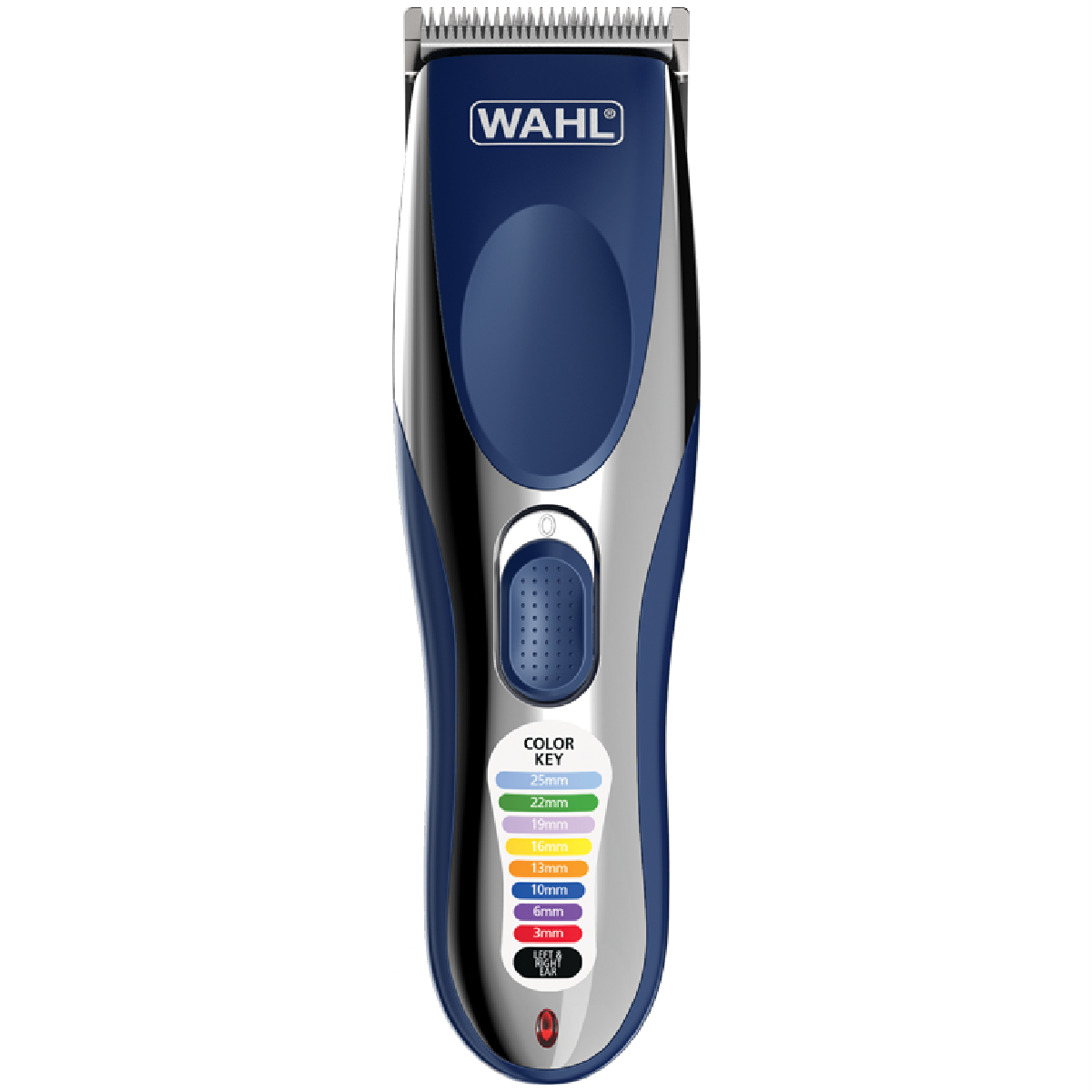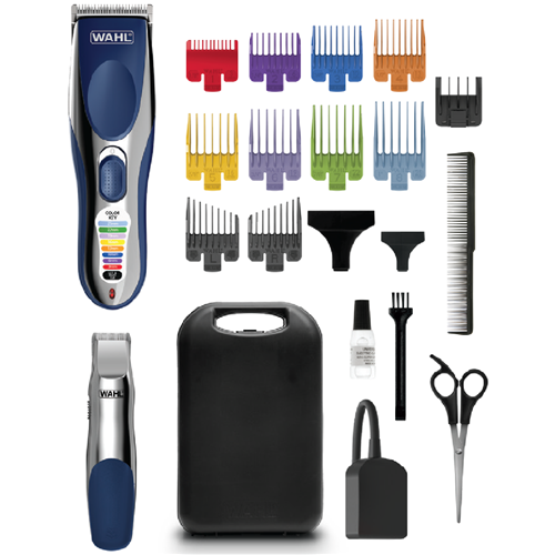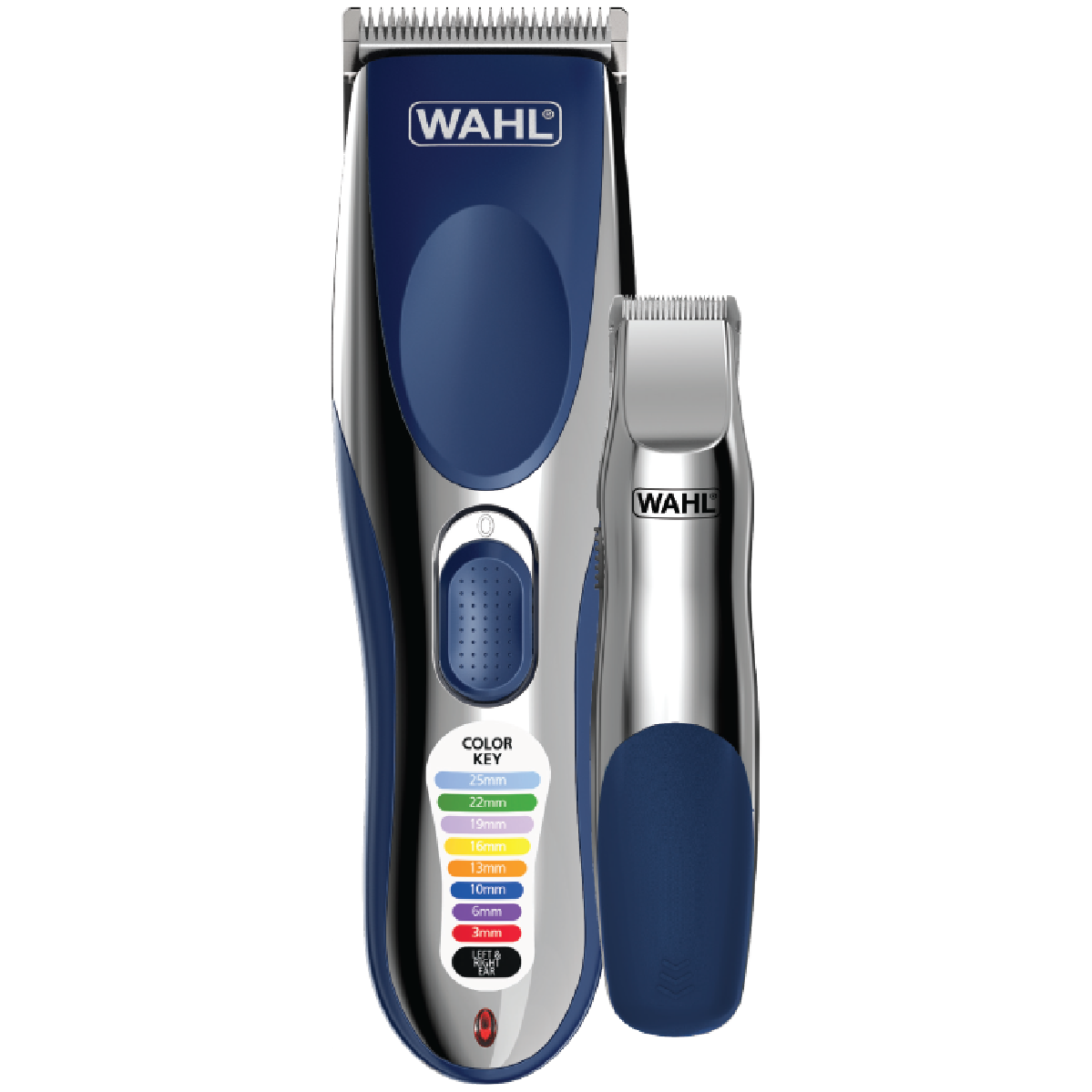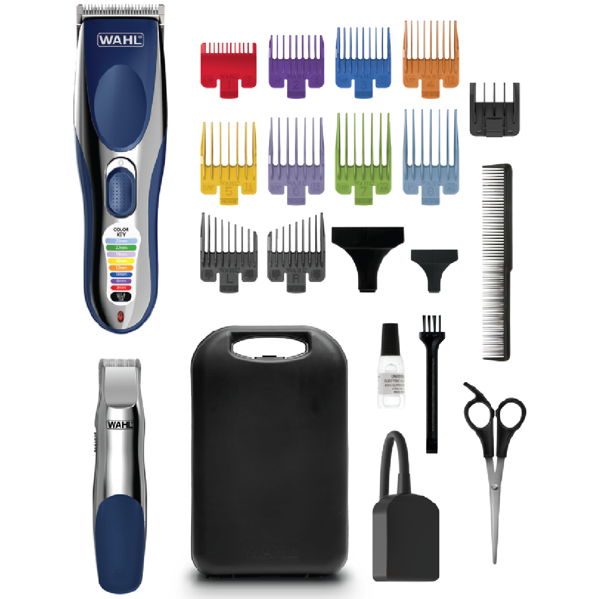 Achieve professional-level haircuts at home with the versatile cordless Wahl Color Pro combo kit. With this must-have hair clipper and trimmer set you'll get the tools needed to style hair your way. The powerful cordless clipper delivers up to 60 minutes of runtime per charge so you can achieve multiple looks on a single charge. Its innovative reinforced guide combs crafted from high-impact polymer glide smoothly through hair while keeping combs firmly in place. A rotary motor provides consistent smooth trimming even through thick coarse hair. The waterproof chrome-finished clipper is easy to rinse clean under the tap. The cordless trimmer powered by AA batteries utilizes self-sharpening precision ground blades for accurate edging and detailing. With the clipper's 10 reinforced guide combs the trimmer's 6-position guide comb styling comb and scissors you'll have everything needed for professional-quality cuts. Give yourself and your family salon-worthy haircuts in the comfort of home with this versatile Wahl hair clipper and trimmer set. The manufacturer's part number for this product is WA9649-2012.