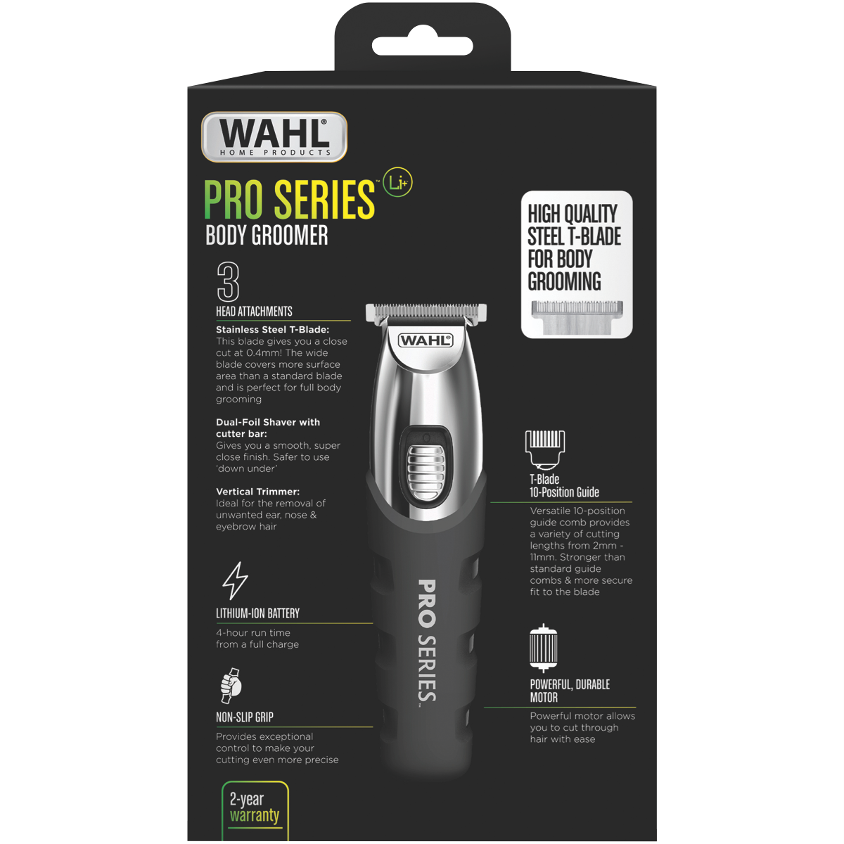 Forget the days of struggling with awkward difficult-to-manoeuvre electric trimmers. The Wahl Pro-Series Trimmer & Body Groomer delivers precision grooming with ease and comfort. Its lightweight ergonomic design features a non-slip grip that ensures maximum control even in wet conditions. Ten adjustable guide combs ranging from 2mm to 11mm allow you to achieve any length with exact precision. The durable stainless steel T-blade and powerful motor effortlessly trim through even the thickest coarsest hair. A lithium-ion battery provides up to 4 hours of cordless runtime per charge. With the T-blade guard foil guard cleaning brush blade oil and storage pouch included this groomer has everything you need to achieve salon-quality results in the comfort of your own home. Backed by a 2 year manufacturer's warranty the Wahl Pro-Series Trimmer & Body Groomer (3025122) is your ticket to quick easy professional-looking grooming.