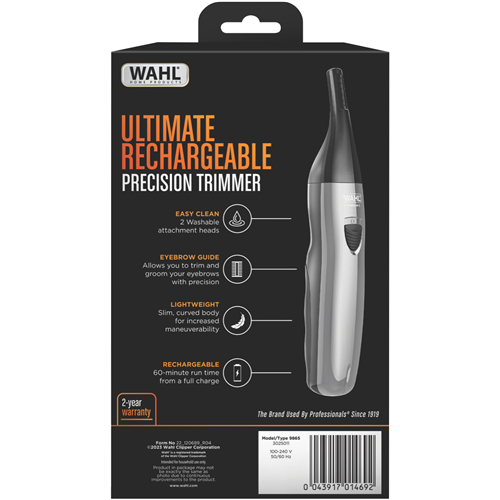 The Wahl Ultimate Precision ear nose and brow rechargeable trimmer is the perfect grooming companion for precise personal trimming needs. This compact all-in-one grooming kit features a vertical trimmer head to easily maintain brows ears and facial hair. The detachable washable attachments ensure effortless cleaning while the integrated eyebrow guide allows you to shape brows with precision. With up to an hour of cordless use from a single charge this versatile electric trimmer provides complete facial grooming on the go. The rotary trimmer head gently removes unwanted hair from ears and nose comfortably. For convenient storage a pouch is included to keep all attachments organized in one place. Backed by a 2 year manufacturer's warranty this precision trimmer delivers reliable trimming performance. Trust Wahl's Ultimate Precision trimmer to keep your brows ears and facial hair neatly groomed anywhere anytime. Order the Ultimate Precision grooming kit today for precise personal trimming when it suits you.
