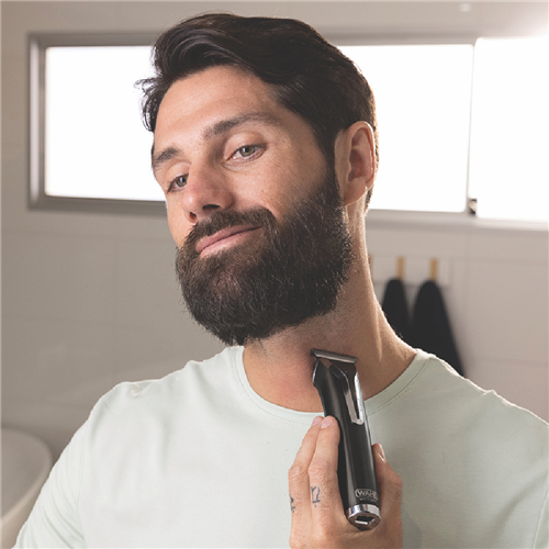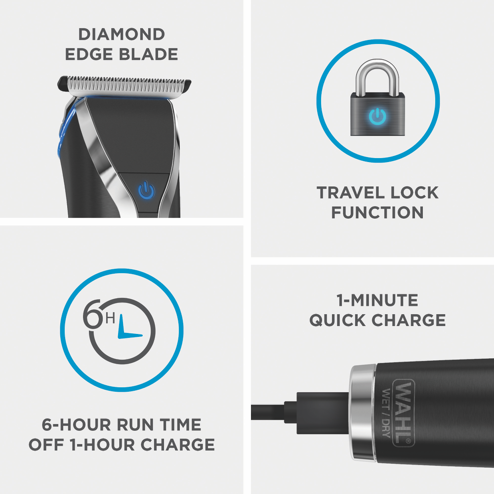 Want to keep your grooming routine smooth and hassle-free? This Wahl Waterproof Stainless Steel Grooming Kit has you covered. With 34 cutting lengths and a diamond like coating on the Ultra Close T Blade you can tackle any trimming task. The kit runs for 6 hours on a single charge and a quick 1-minute charge gives you power in a pinch. Its wet and dry capabilities make it perfect for use in or out of the shower. The vertical trimmer head helps you easily tidy up ear nose and eyebrow hair. Plus the travel lock feature keeps it secure on the go. Backed by a 2-year warranty this Wahl grooming kit (WA9898-212) is a reliable companion for all your grooming needs.