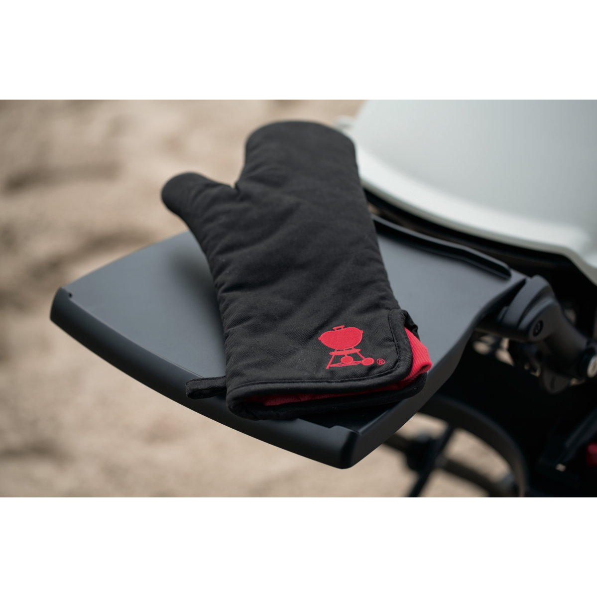 Whether you're firing up the barbie for a summer feed with mates or preparing a mouthwatering roast for the family keep your hands safely shielded from the heat with the Weber Barbecue Mitt. This quality black mitt features the iconic Weber kettle grill emblem embroidered in bright red adding a pop of color while showing your Weber pride. The heat resistant liner provides reliable protection when handling hot grill grates or moving piping hot trays of snags and chops. The smooth comfortable liner allows easy movement and grip security when flipping steaks or moving food around the grill surface. With its durable and thermal-resistant construction the Weber mitt enables effortless handling of grilling tasks while keeping hands shielded from burns. For barbecuing brilliance with safety and comfort look no further than the Weber Barbecue Mitt. The manufacturer's part number for this product is 6532. Protect your hands while handling the heat with Weber's quality barbecuing mitt.