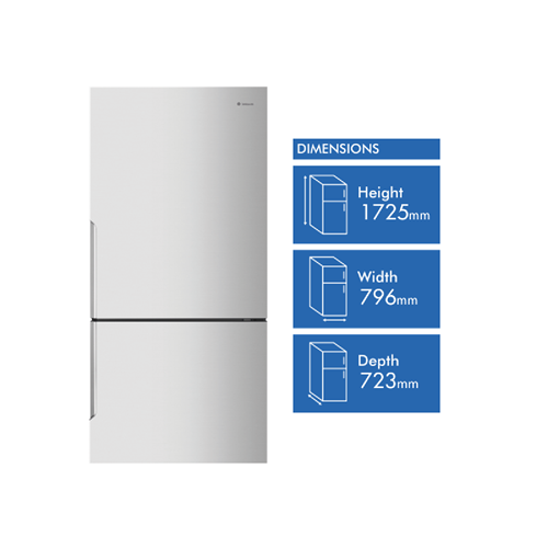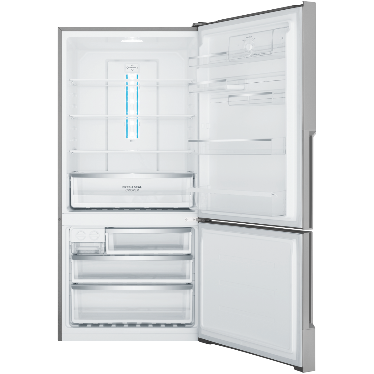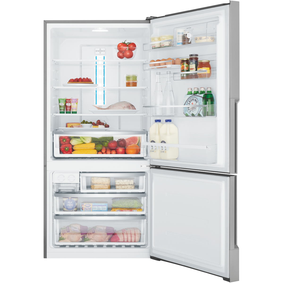 496L bottom freezer fridge natural stainless steel with manual humidity-controlled crisper 5 star energy rating SpillSafe glass shelves telescopic runners on the freezer drawers & FlexStor adjustable storage solutions.