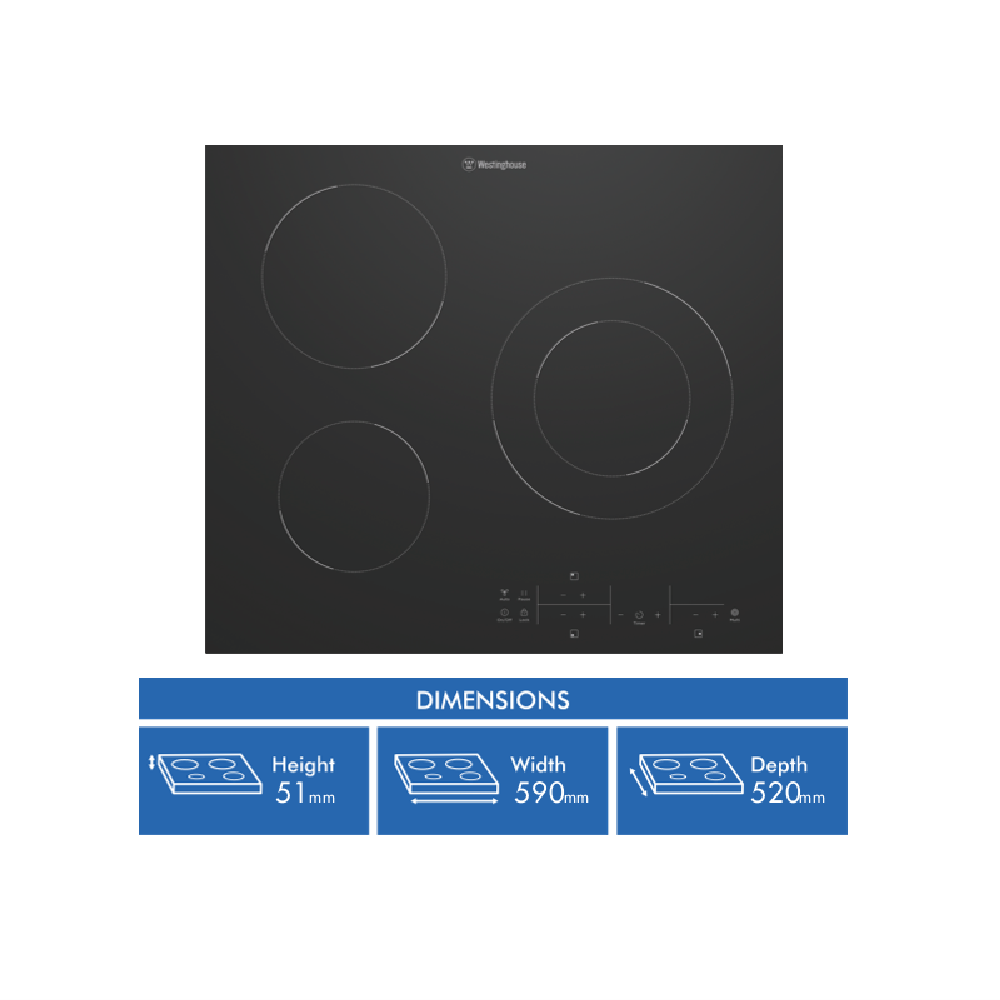 Simplify cooking with the Westinghouse 60cm Ceramic Cooktop. Its sleek black ceramic glass finish adds a modern touch to your kitchen while providing an easy-to-clean surface. With three cooking zones and nine power levels you can prepare multiple dishes simultaneously to suit your needs. The touch controls and built-in timer make operation a breeze. Safety features like the child lock residual heat indicators and automatic safety switch off give you peace of mind. Measuring 590mm wide 51mm high and 520mm deep this electric cooktop fits well in most kitchen spaces. Enjoy reliable performance backed by a 2-year manufacturer's warranty. Model number: WHC633BE.