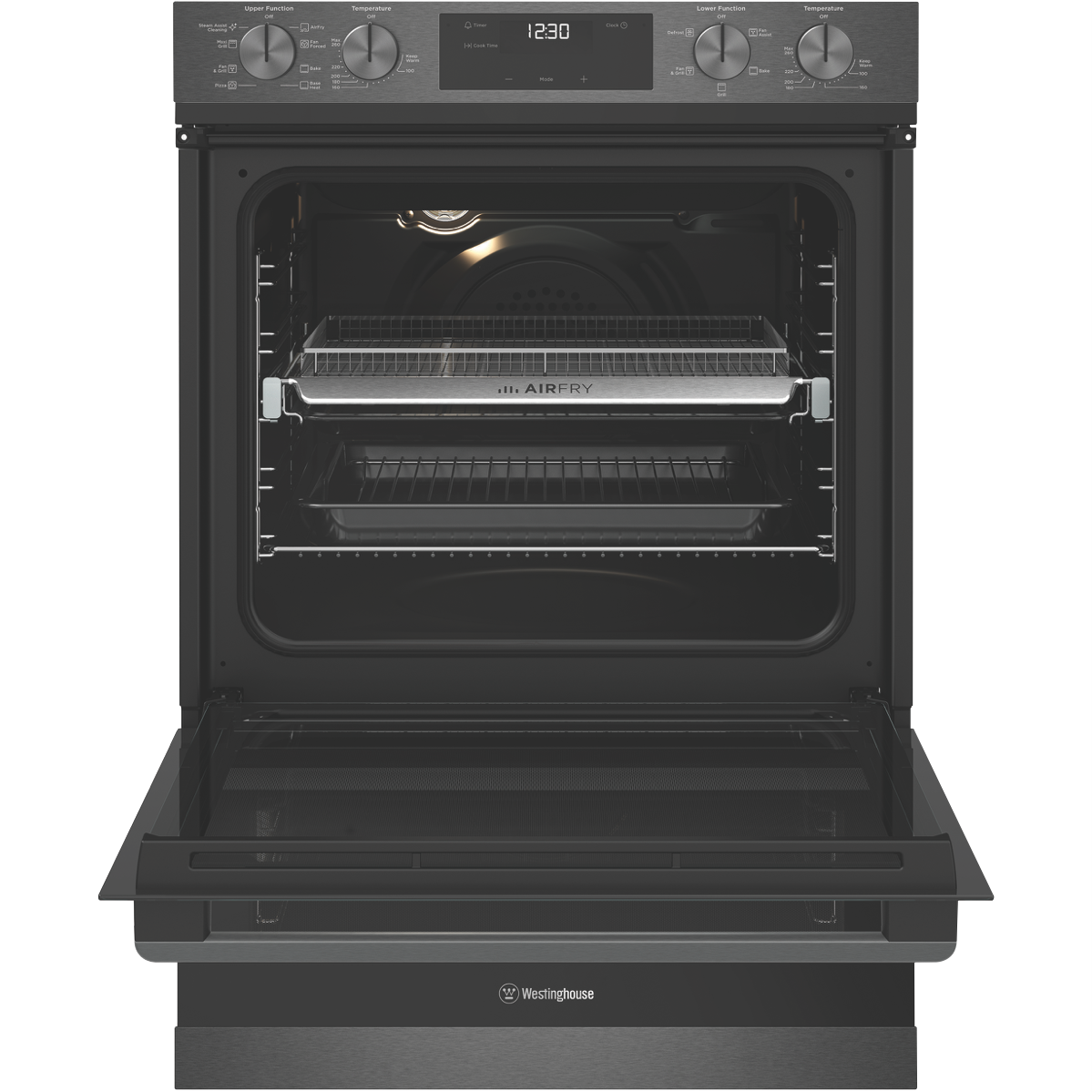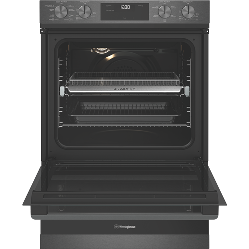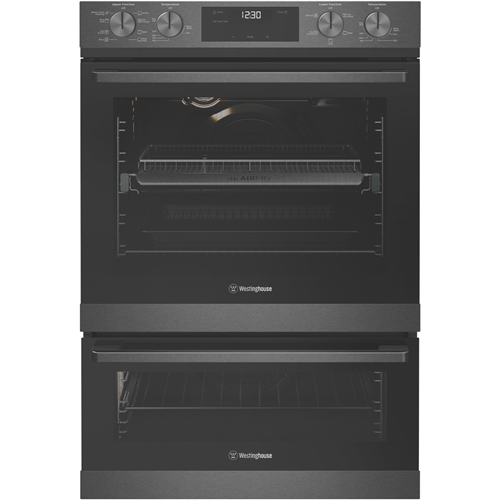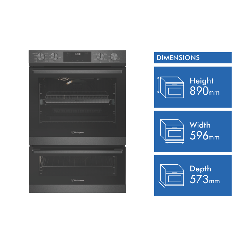 The stylish Westinghouse 60cm Electric Double Oven in Dark Stainless Steel finish is designed to be the centerpiece of your kitchen. With generous 72L and 38L usable capacities this double oven lets you cook multiple dishes at once. The main oven has 8 functions including AirFry SteamAssist Clean pizza and traditional bake while the second oven has 5 functions like grill bake and defrost. The control knob and touch control LED panel offer convenient operation. The included accessories like baking trays grill inserts oven racks and more let you get cooking straight away. This double oven can be installed by a professional to maximize your cooking potential. With a 2 year manufacturer's warranty the Westinghouse Double Oven provides the reliability and performance you need to feed the whole family. The manufacturer's part number for this product is WVE6526DD. Bring home the Westinghouse 60cm Electric Double Oven today for serious multi-tasking abilities.