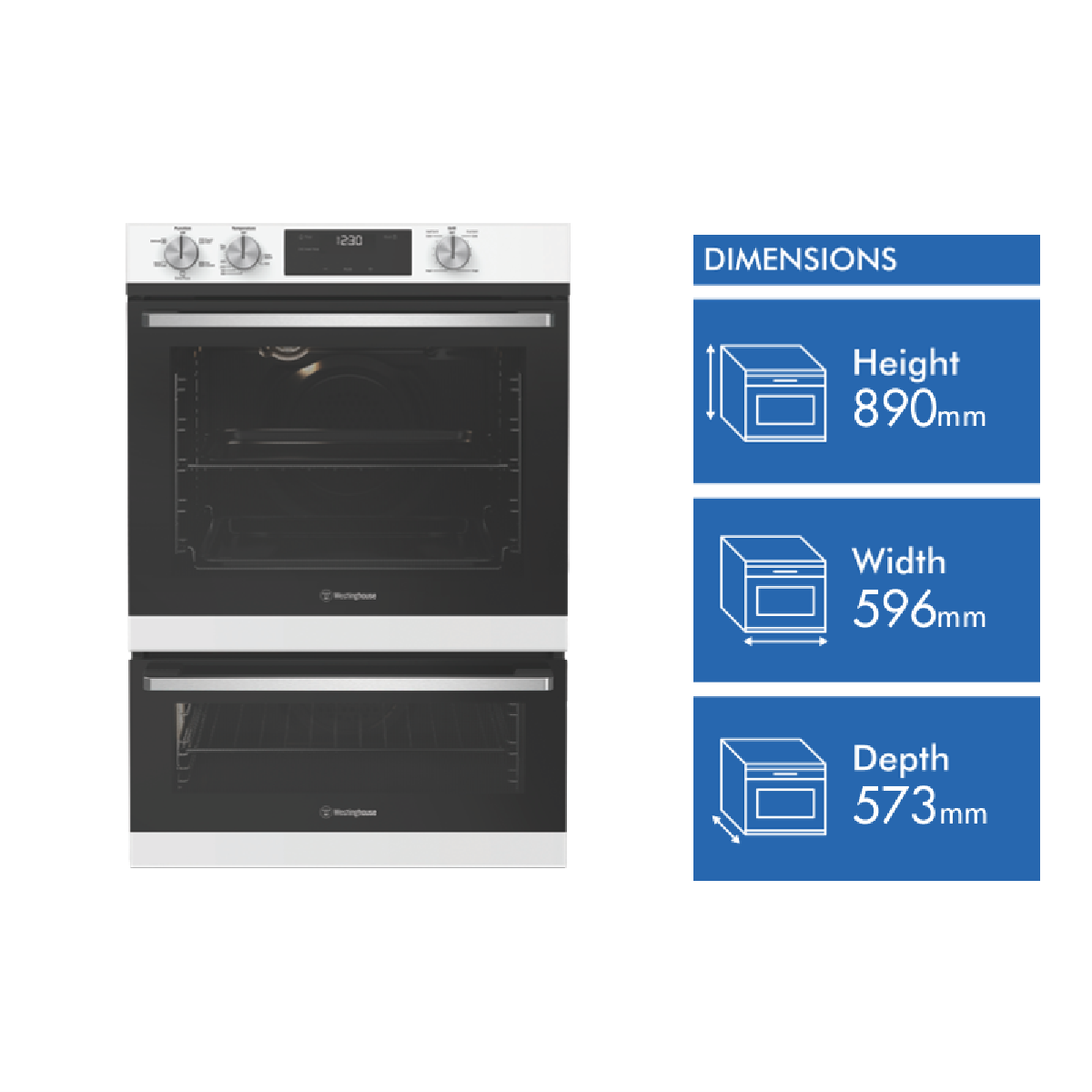Discover the perfect solution for cooking up family meals and entertaining friends with the Westinghouse 60cm Electric Double Oven with Separate Grill. This stylish appliance will be the centerpiece of your kitchen with its sleek white finish and stainless steel accents. The generous 72L main oven cavity provides ample space to cook multiple dishes at once while the 38L second oven lets you prepare side dishes or desserts simultaneously. With five diverse oven functions like Bake Fan Forced and Rapid Heat you'll have precision control to achieve perfect results. The separate grill with drop-down door grants easy access for faster grilling. This double oven simplifies meal prep with its intuitive control knob and touch buttons cool-to-touch door and handy 60 minute timer. The removable inner glass panes and oven shelves enable effortless cleaning. It also comes equipped with a grill pan wire shelves baking tray and more. With a 2 year warranty this Westinghouse double oven will be a workhorse in your kitchen for years to come.The manufacturer's part number for this product is WVE6565WD. Discover how this electric double oven can make mealtimes easier.