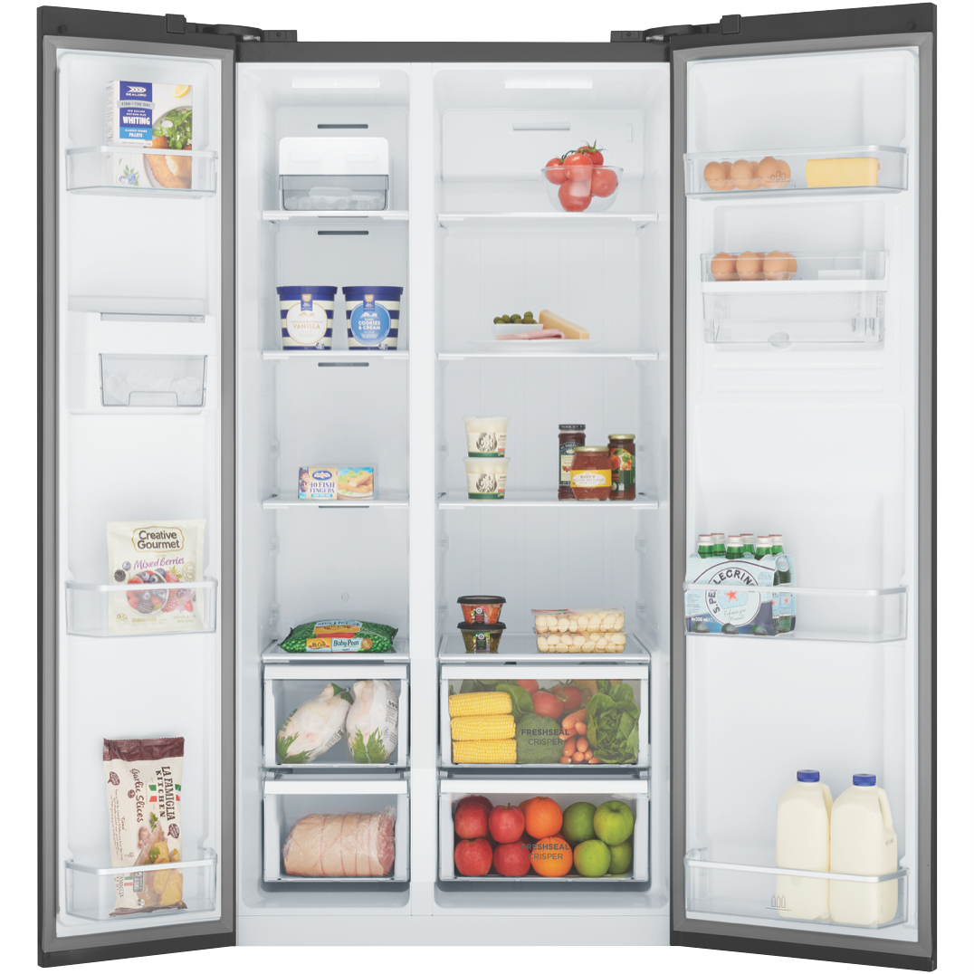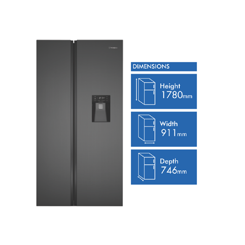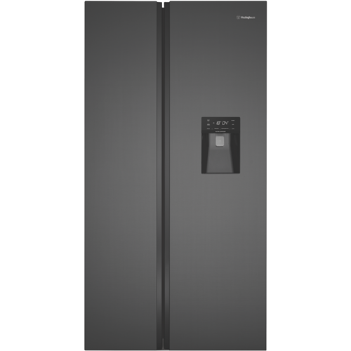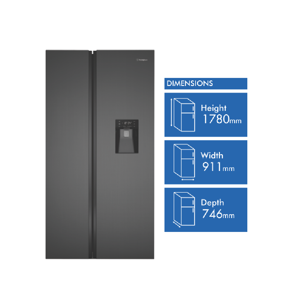 For a stylish and spacious fridge that simplifies your food storage look no further than the Westinghouse 619L Side By Side Refrigerator. This matte charcoal black fridge blends into any modern kitchen with its sleek flat doors and integrated handles. With a total capacity of 619 liters you'll have ample room for all your fresh and frozen foods. The 402-liter fridge capacity features SpillSafe glass shelves a fast chill function and an egg tray so you can organize fruits vegetables drinks and more. The 217-liter freezer capacity includes two icemakers and a fast freeze function to lock in freshness. Electronic touch controls and LED lighting provide convenient access and visibility. Plus this energy efficient fridge is rated an impressive 4.5 stars so you'll save on electricity bills. Water dispenser holiday mode and 2-year warranty add even more value. Bring stylish spacious refrigeration into your home with the Westinghouse 619L side by side fridge. The manufacturer's part number for this product is WSE6640BA.