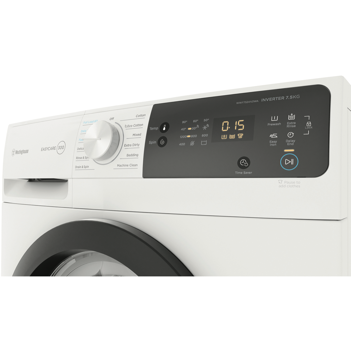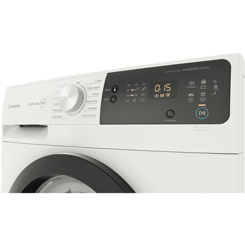 Tackle laundry day with ease thanks to the Westinghouse 7.5kg Front Load Washer. This white washing machine makes light work of all your clothing and linen needs for the whole family. With a generous 7.5kg washing capacity 12 diverse wash programs and a quick 15 minute FAST cycle this Westinghouse washer enables you to refresh clothes in a hurry or give heavily soiled items an intense clean. The range of wash settings include Delicate Bedding Drain & Spin Cotton Mixed Extra Dirty Machine Clean and Eco Cotton so you can select the ideal mode for each load. Additional handy features like the Delay End function let you schedule wash completion times to suit your lifestyle while the Add Clothes button provides the flexibility to throw in last minute items mid-cycle. An intuitive LED display with dial control makes operation straightforward. This front loader also boasts a high 1200RPM spin speed to reduce drying times. Rated an impressive 4 stars for water efficiency the washer uses an economical 76 litres per wash. With an energy rating of 3.5 stars the Westinghouse washer helps to save on running costs too. Covered by a 2 year warranty for peace of mind this quality washing machine will keep your laundry looking great for years to come. The manufacturer's part number for this product is WWF7524N3WA. Discover how this Westinghouse front load washer can make laundry simple today.