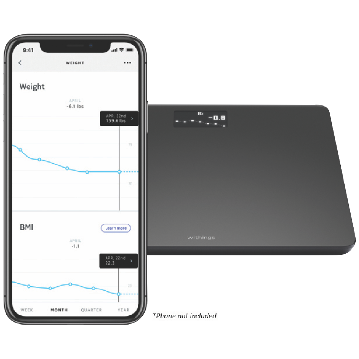 Get an accurate measurement of your weight and BMI and easily track your progress thanks to this clinically tested Withings Body Weight & BMI Wi-Fi Scale (Black) WBS06BLACKNAU. Body is an advanced connected scale providing immediate on-screen feedback via weight trend and BMI screens and automatically syncing with the downloadable Withings Health Mate app on your smartphone - simply set a weight goal manage your weight and see progress over time. You won't need to have your phone with you while you weigh-in to synchronise your data. Plus the screen displays a trend of your last eight weigh-ins and automatically calculates your BMI to give you a picture of how you're tracking. Patented Position Control technology delivers a highly precise measurement of weight and BMI accurate to approximately 100 grams and allows up to eight users to track their weight and achieve their individual goals. These smart scales even have a Pregnancy Mode so expecting mothers can accurately track pregnancy weight gain while Baby Mode offers easy monitoring of baby's weight; simply by stepping on the scale while holding them.