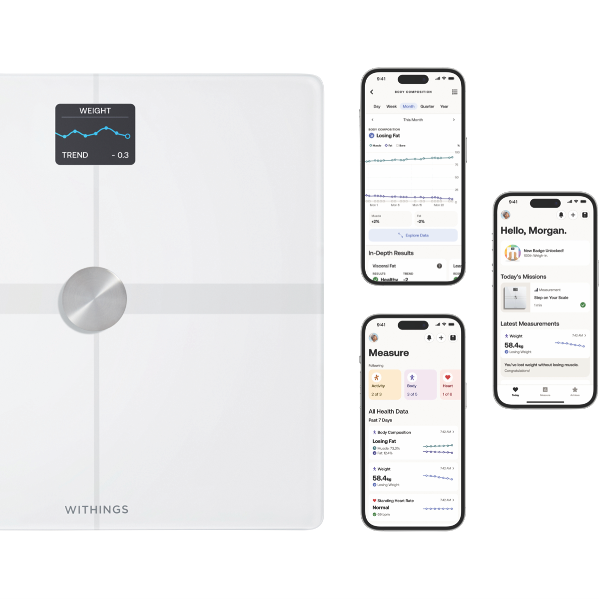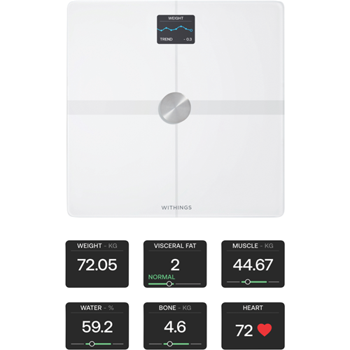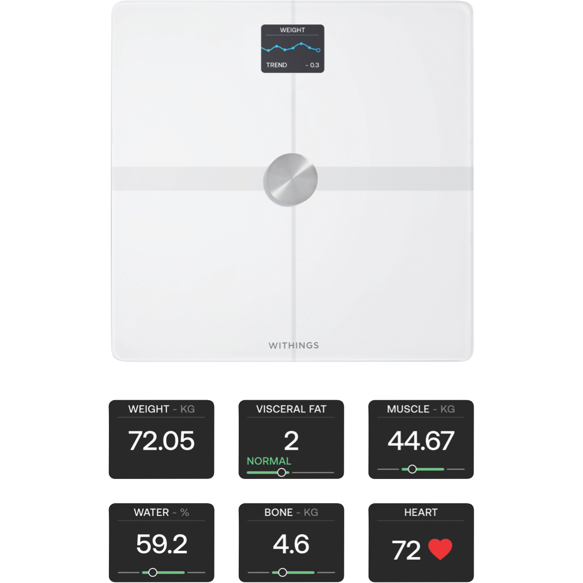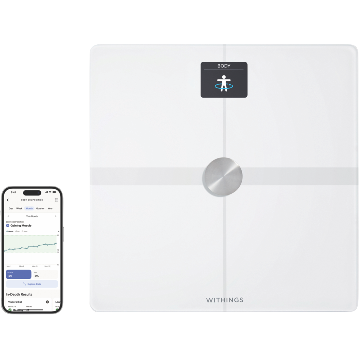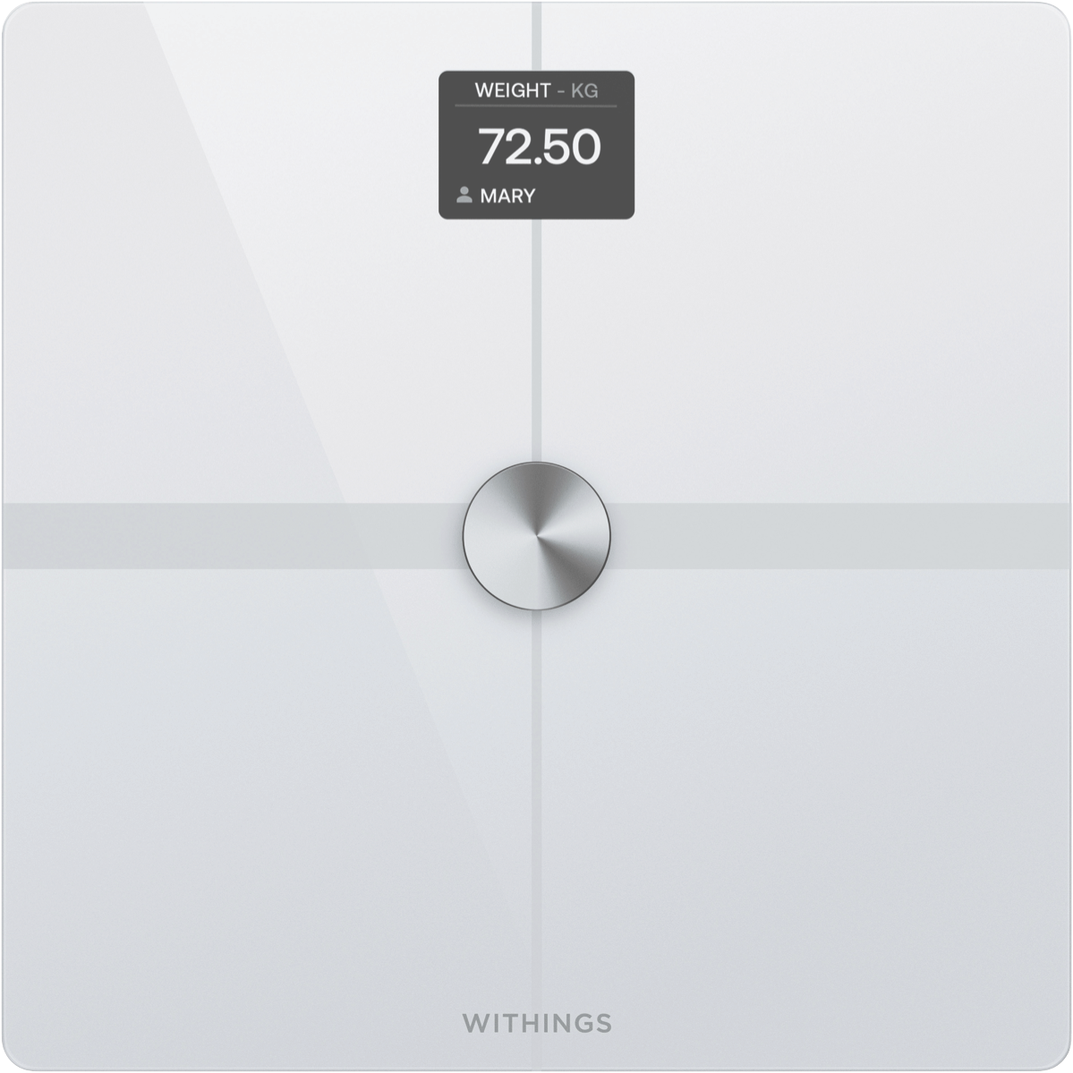 Step up to next-gen health tracking with the Withings Body Smart Scale. This sleek white smart bathroom scale provides in-depth body composition analysis to help you achieve your fitness goals. Using advanced weight sensors and Bluetooth connectivity it measures your weight BMI body fat and water percentage muscle and bone mass and more. The colour LCD display shows your stats along with a daily weather forecast to start your day informed. For added convenience it automatically recognizes up to 8 users and syncs data with Apple Health Google Fit and 100+ health and fitness apps via WiFi or Bluetooth. With a tempered glass platform and sturdy design that holds up to 200kg this smart scale delivers precise body metrics for the whole family. Powered by AAA batteries the Withings Body Smart Scale combines cutting-edge innovation with everyday simplicity. Track your fitness journey with insightful data. The manufacturer's part number for this product is WBS13-WHITE. Make healthy progress with the Withings Body Smart Scale today.