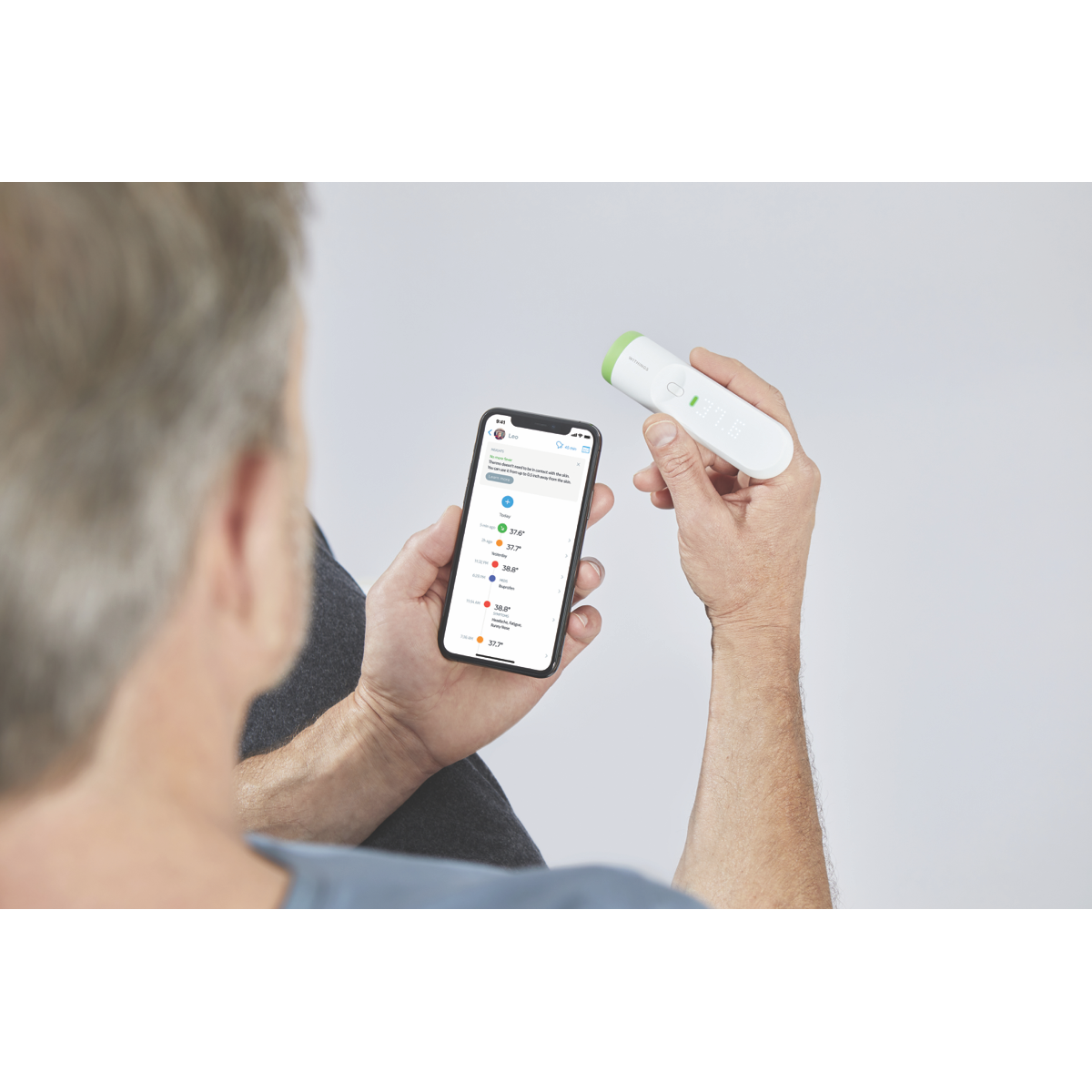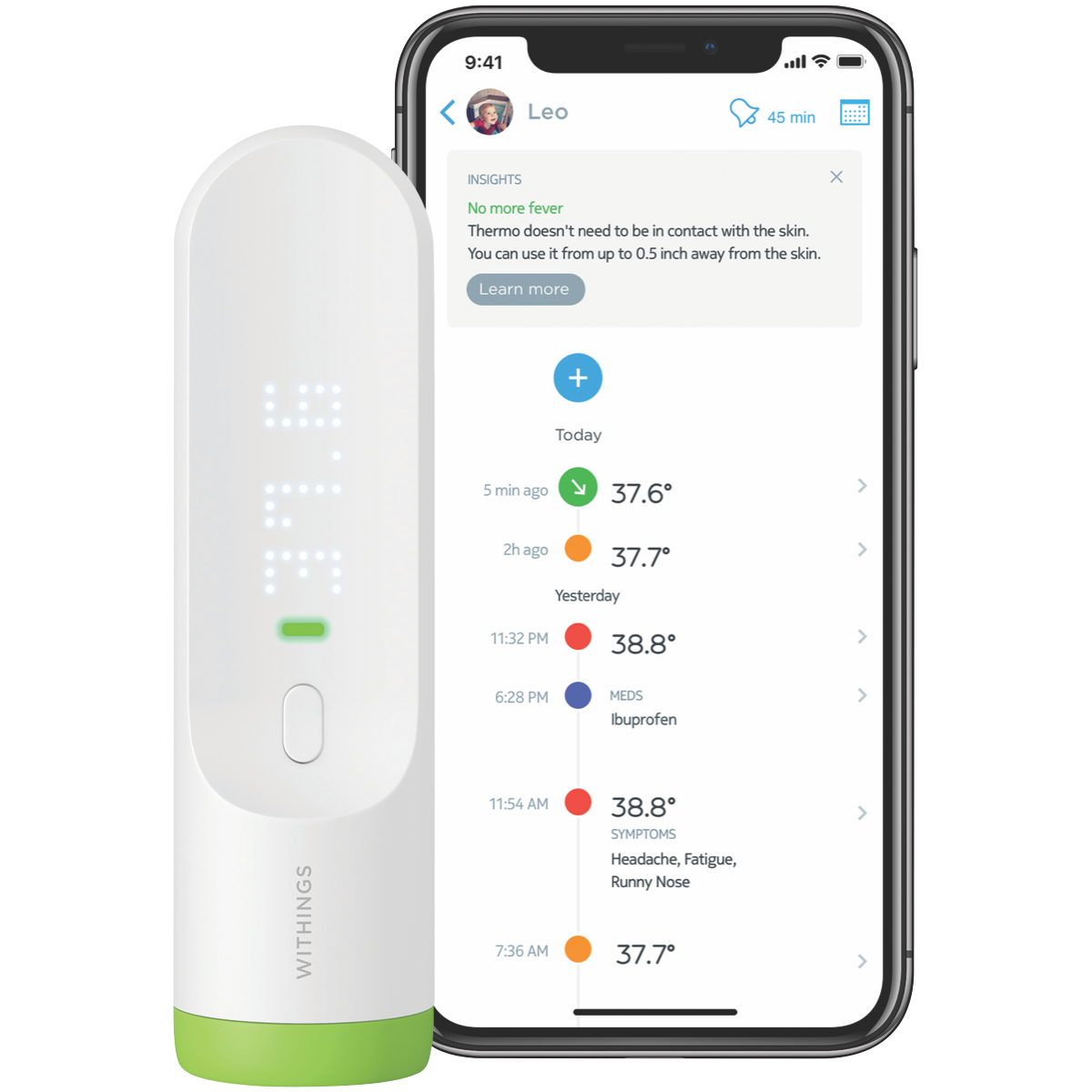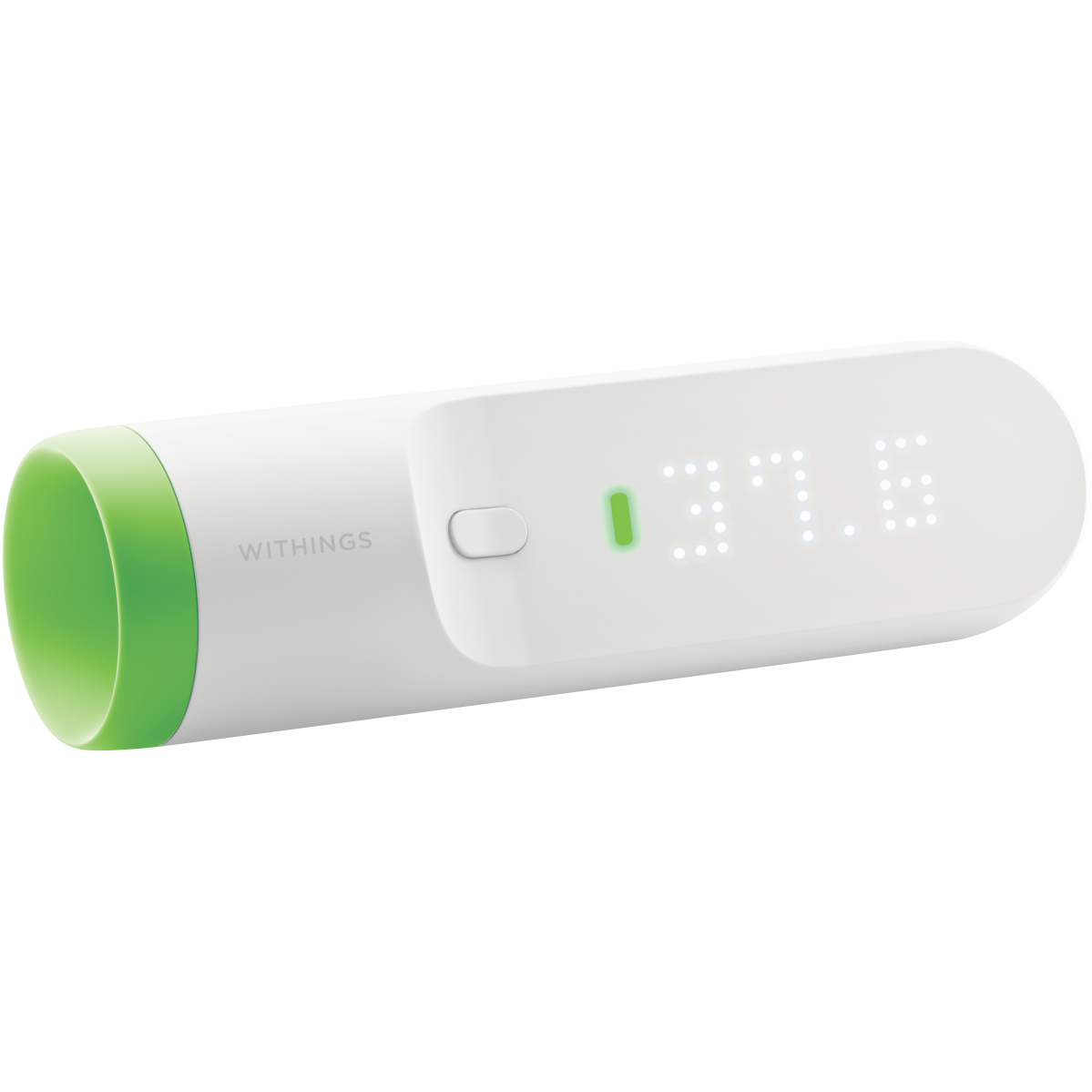 Take precise temperature readings with the sleek and innovative Withings Thermo Smart Temporal Thermometer. This digital thermometer delivers accurate results in seconds through a touch-sensitive slider and large LED matrix display. With Bluetooth connectivity it syncs readings directly to the Withings app on your iOS or Android device for convenient tracking over time. The thermopile sensor array ensures clinical accuracy while the compact 116mm x 33.2mm dimensions and lightweight 75g body make it easy to use anywhere. Monitor your health with the convenience of touch-free scanning across the forehead for all family members. No more fumbling with cumbersome thermometers thanks to the one touch design. This essential health tool helps identify fevers faster so you can get back to feeling your best. Bring smart connected health tracking into your home with the Withings Thermo. The manufacturer's part number for this product is SCT01-N-AU. Learn more about this precise temporal thermometer today.