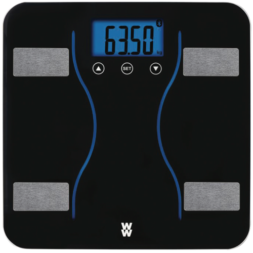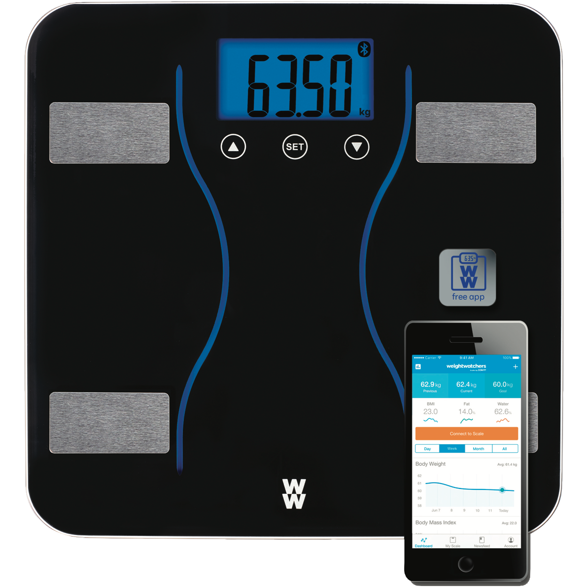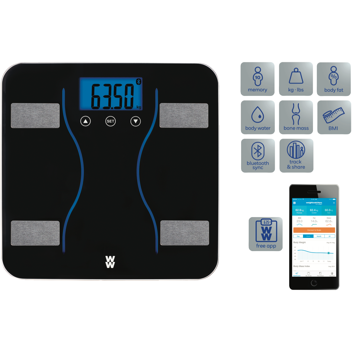 Step on the WW Body Analysis Bluetooth Diagnostic Scale and unlock a wealth of insights into your health. With its sleek black tempered glass construction this smart scale provides 10 user profiles and seamlessly syncs your weight body fat body water BMI and other metrics via Bluetooth to your iOS or Android device. By tracking your progress over time this scale helps you meet your goals whether that's losing fat gaining muscle or maintaining your weight. The 4.8cm digital readout with blue backlit display ensures easy visibility while the 182kg weight capacity provides durability and stability for users of all sizes. With a 10 year manufacturer's warranty this scale is built to last. The manufacturer's part number for this product is WW310A. Monitor your health and stay on track with your fitness objectives with this innovative Bluetooth scale..