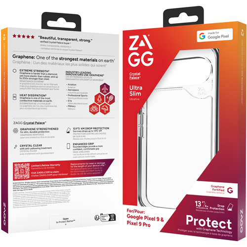 Keep your Pixel 9 or 9 Pro looking pristine with the ZAGG Crystal Palace Case. This clear case lets your phone's design shine through while providing reliable protection against everyday wear and tear. At just 205mm tall 109mm wide and 21mm deep it adds minimal bulk to your device. Plus you can count on ZAGG's quality with a 2-year manufacturer's warranty. Part number 11901320112.